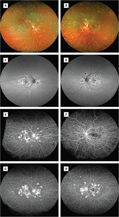 The patient’s best-corrected visual acuity at the time of the exam was 20/400 OU. At a follow up appointment 16 weeks after the initial exam, his visual acuity improved to 20/25 OU.