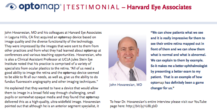The features of an optomap also make it the preferred diagnostic tool for many eye doctors, including Dr. John Hovanesian of Harvard Eye, who understands that many problems with retinal health are subtle and easy to miss with less precise tools.