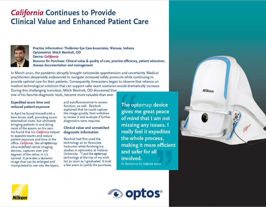 Reinholt acquired his California device in 2019 primarily for clinical value and the ability to get unmatched retinal information, but also because the ease and speed of acquisition expedited the exam process and impressed his patients. Additionally, he found that the technology further streamlines the exam process by enabling him to quickly image children and other difficult to examine populations.