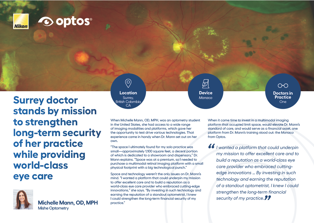 During her Optometry studies in the United States, Michelle Mann, OD, MPH was given the opportunity to practice on several imaging modalities and platforms. When ready to open her solo practice – Mishe Optometry in BC, Canada – Mann selected the device that stood out during her training: the Optos MonacoPro. Introducing MonacoPro to her practice enhanced the clinic’s overall flow, enabled Dr. Mann to see more patients and improved her overall financials.