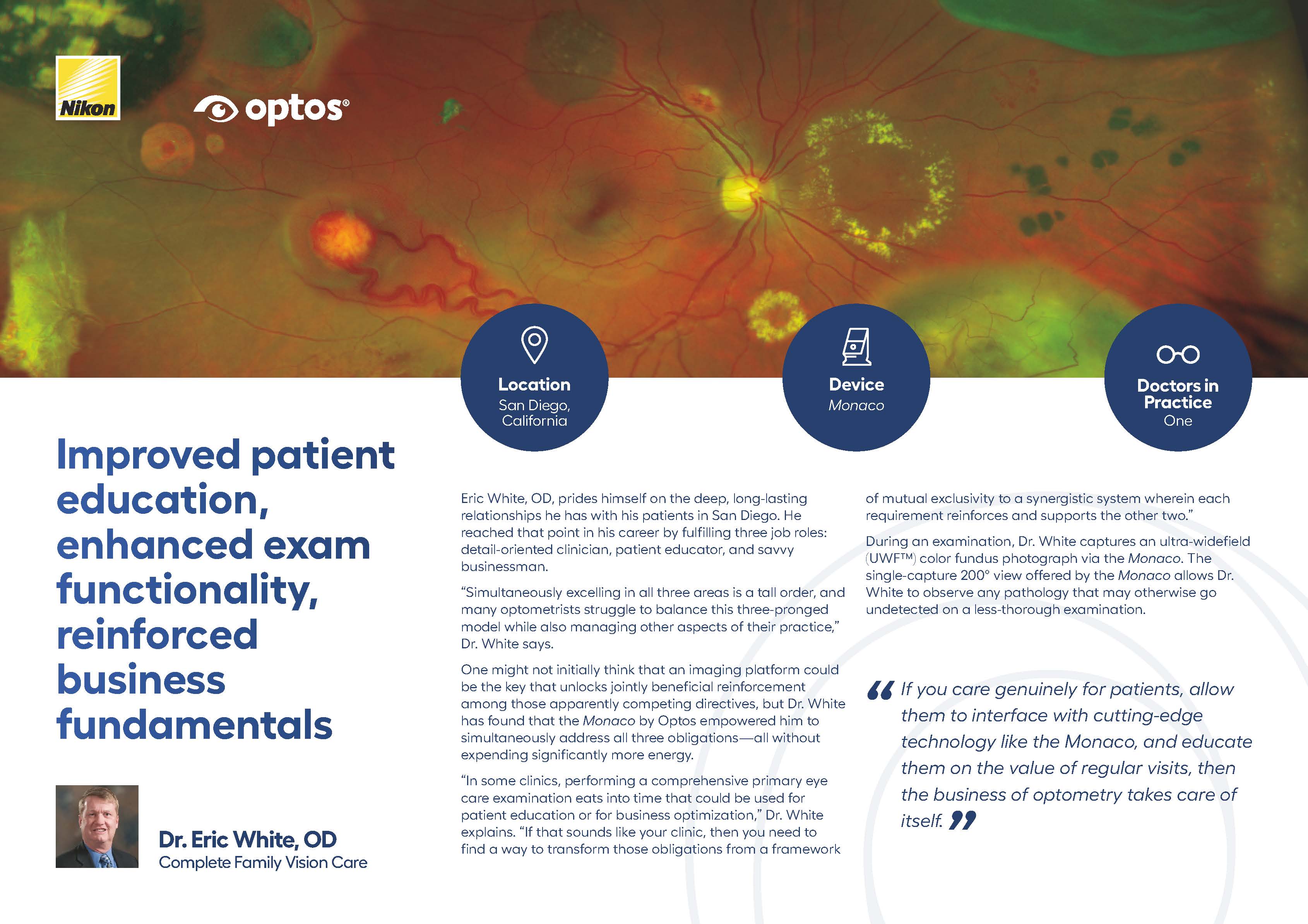 “I’m a long-time Optos user, and the company’s innovations have allowed me to elevate the quality of care I provide for over two decades. If you care genuinely for patients, allow them to interface with cutting-edge technology like the MonacoPro, and educate them on the value of regular visits, then the business of optometry takes care of itself,” Dr. White explained.