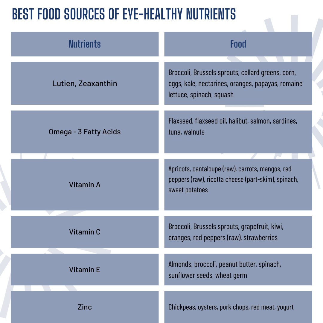 Certain foods keep not only tummies happy but also your eyes. According to an article from Harvard Health Publishing, select nutrients such as omega-3 fatty acids, mineral zinc as well as vitamins A, C and E may help prevent cataracts and age-related macular degeneration.3 Improve your overall health and your vision by adding a few options from the table below into your diet.