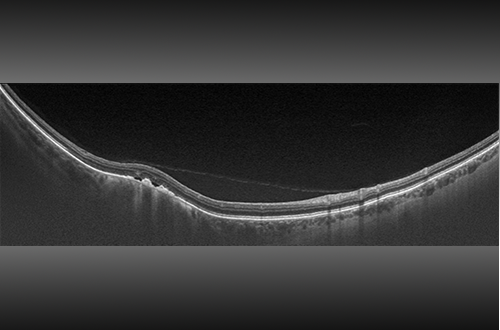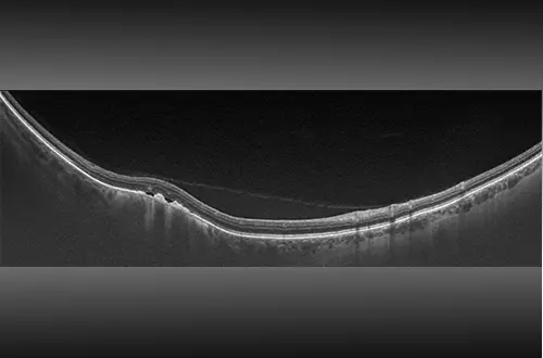 Swept-source facilitates examination of the retina from vitreous through the choroidal-scleral interface. The SS-OCT and UWF combination produces a 200° single-capture optomap image in less than ½ second and enables guided OCT scanning across the retina and into the far periphery. The image shown is a 23 mm line scan.