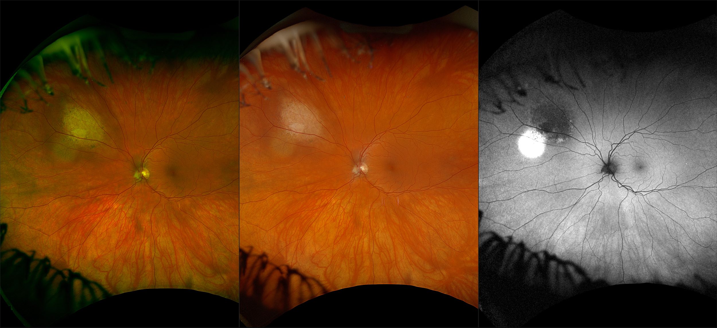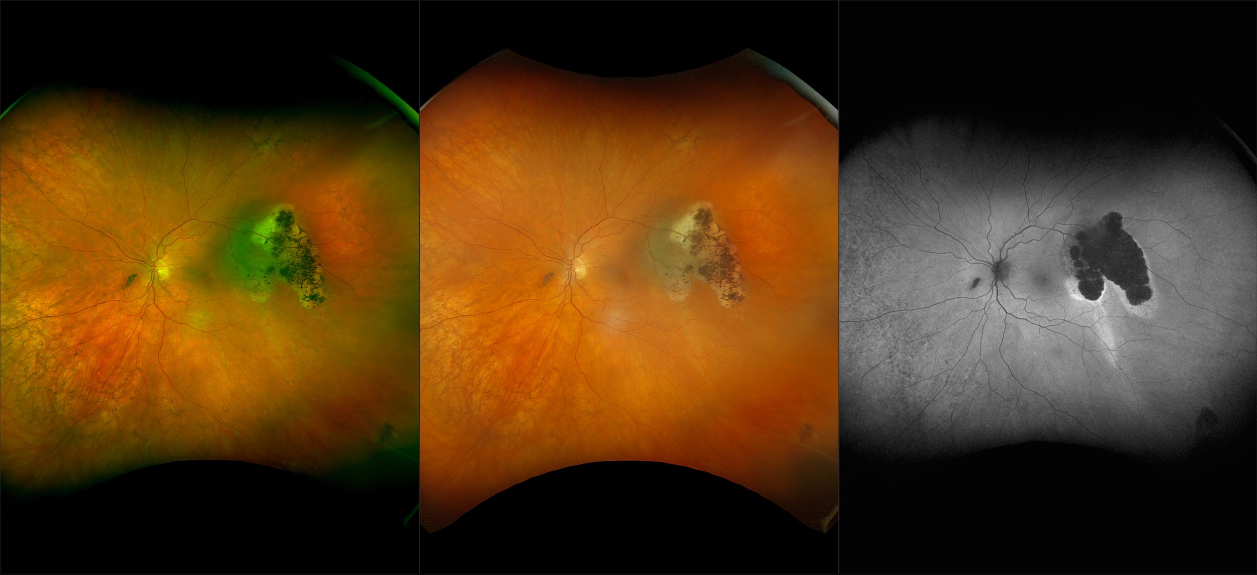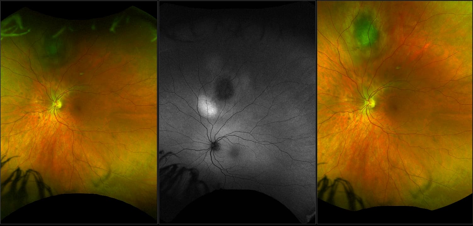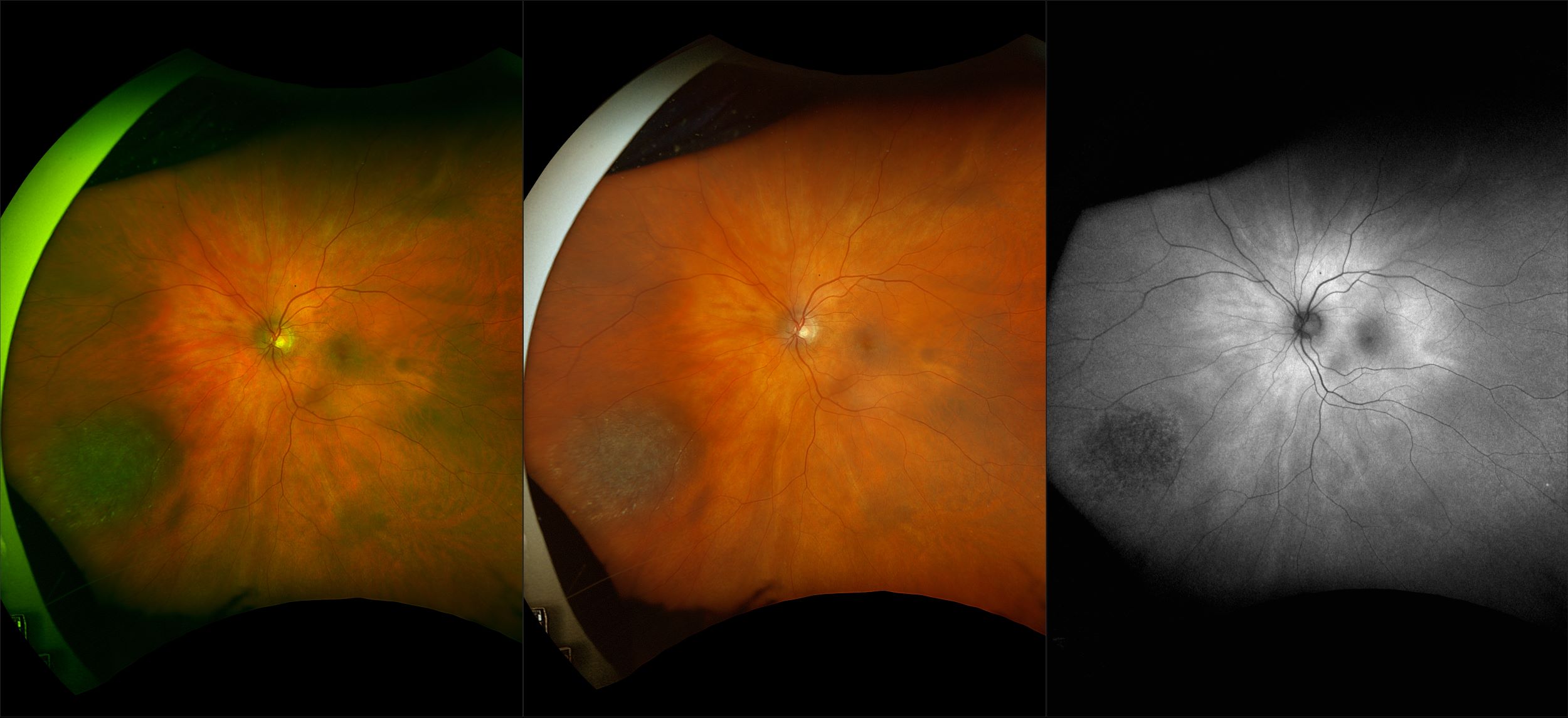 A choroidal nevus is simply an accumulation of melanocytes in the choroid. They are a space occupying mass or a benign melanoma. Choroidal nevi are slate gray in color, have indistinct margins, and may be slightly elevated (1-2 diopters). Since they are in the choroid, they are usually only seen in the red separation and not the green. The green separation may show the RPE degeneration associated with nevi which is seen as pigment mottling and drusen.