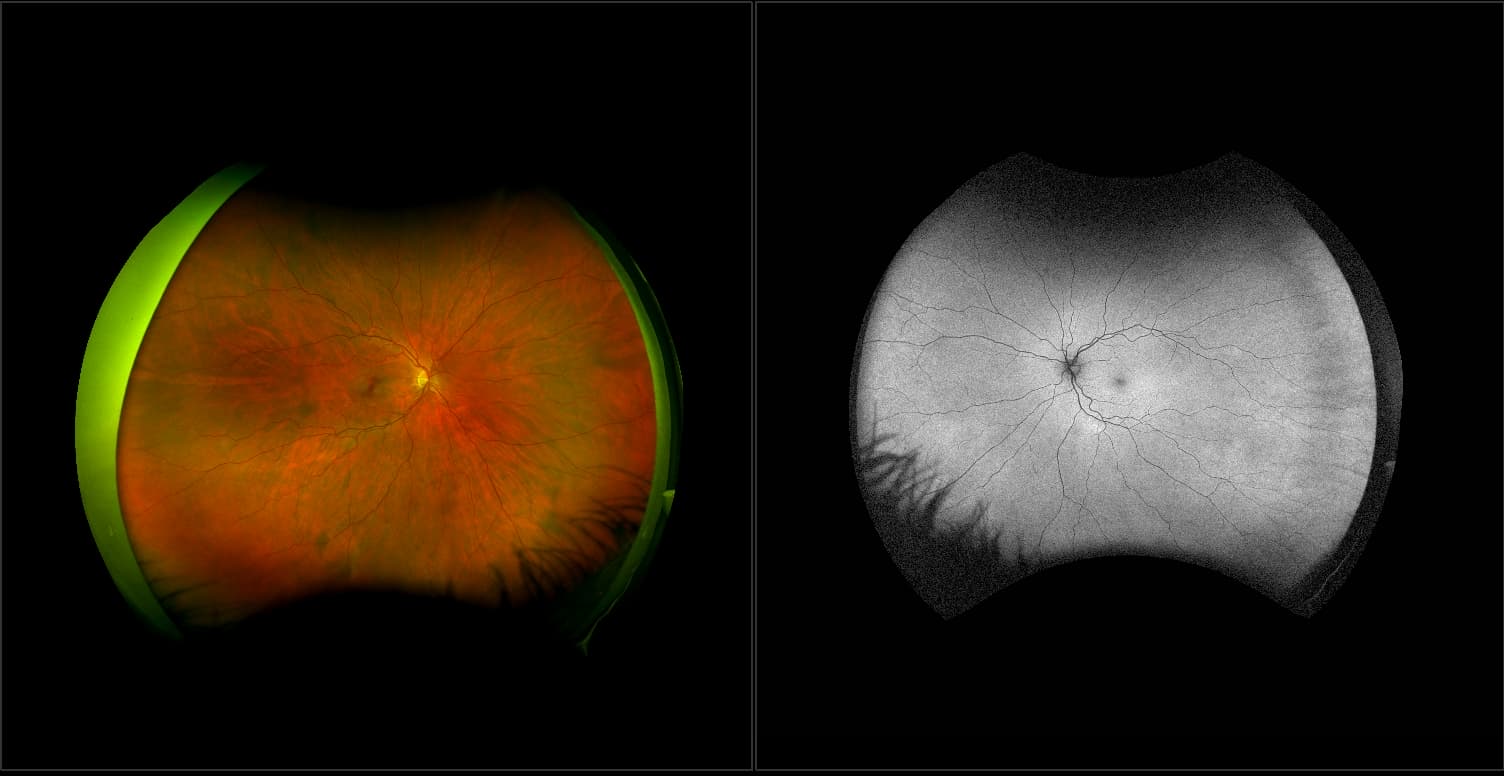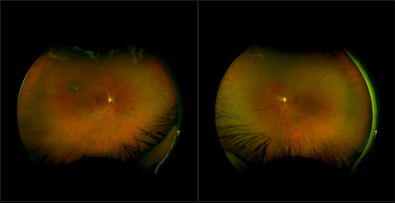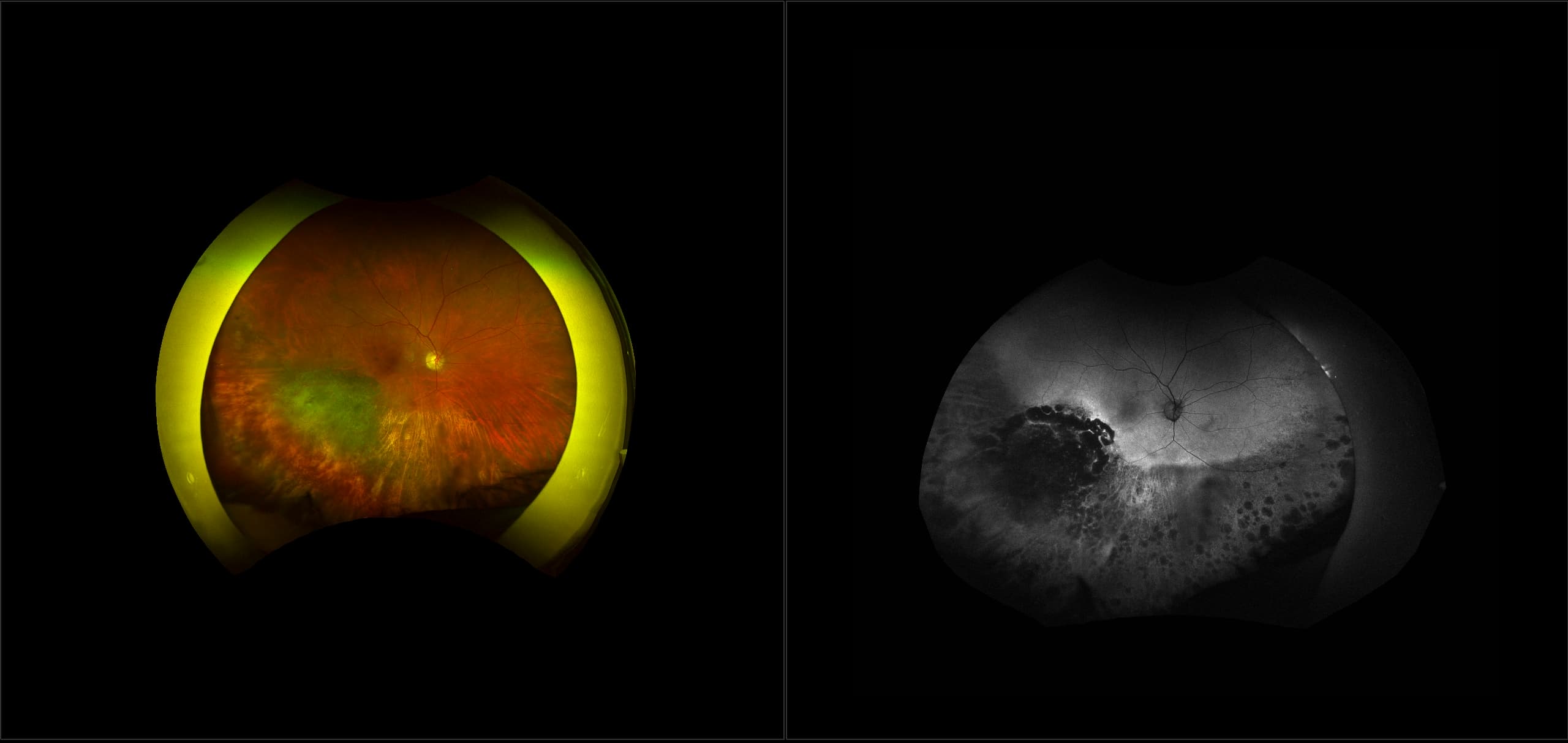 A choroidal nevus is simply an accumulation of melanocytes in the choroid. They are a space occupying mass or a benign melanoma. Choroidal nevi are slate gray in color, have indistinct margins, and may be slightly elevated (1-2 diopters). Since they are in the choroid, they are usually only seen in the red separation and not the green. The green separation may show the RPE degeneration associated with nevi which is seen as pigment mottling and drusen.
