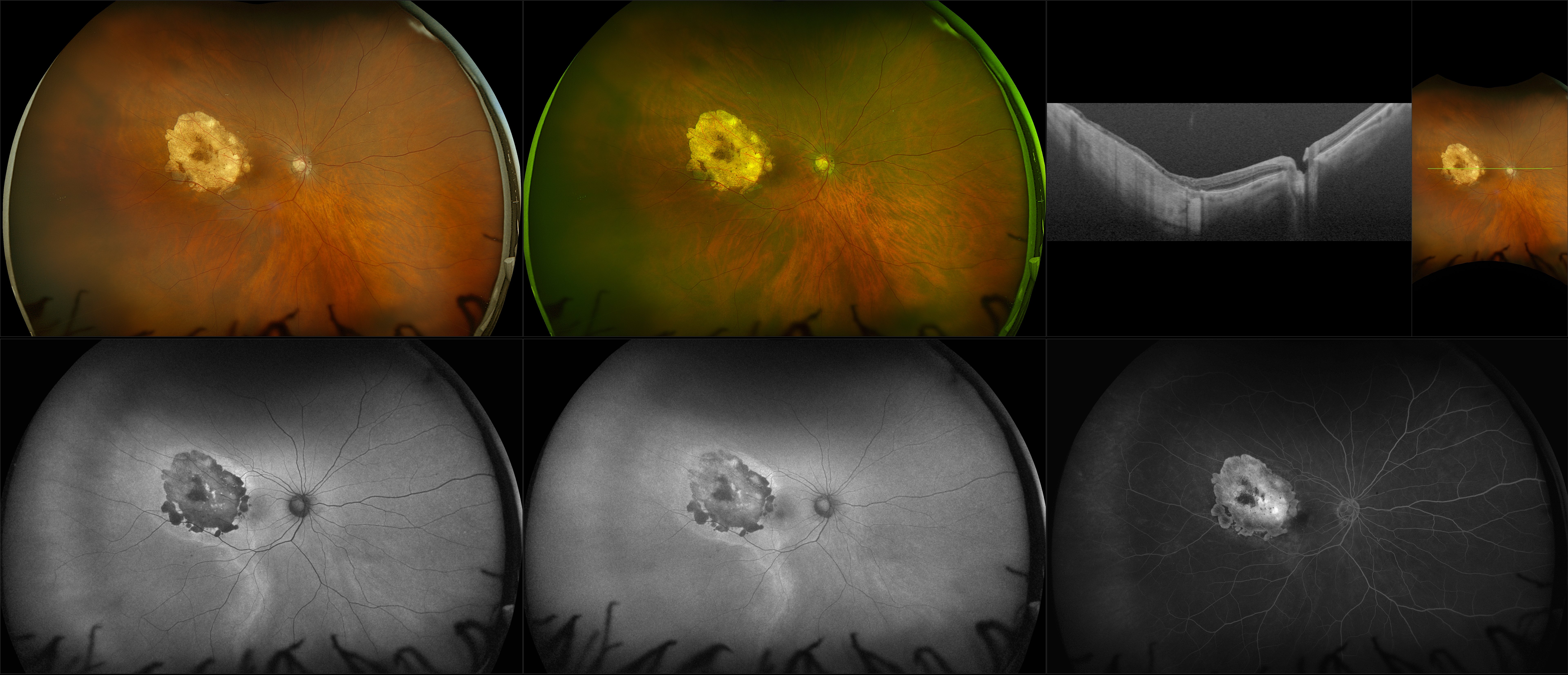 Silverstone - Malignant Choroidal Melanoma with Radiation Retinopathy, 2+ Nuclear Sclerosis Cataract (OD) - RG, RGB, AF, BAF, FA, OCT - Line, UWF Line, Raster, ONH, Navigated Line, Navigated Volume