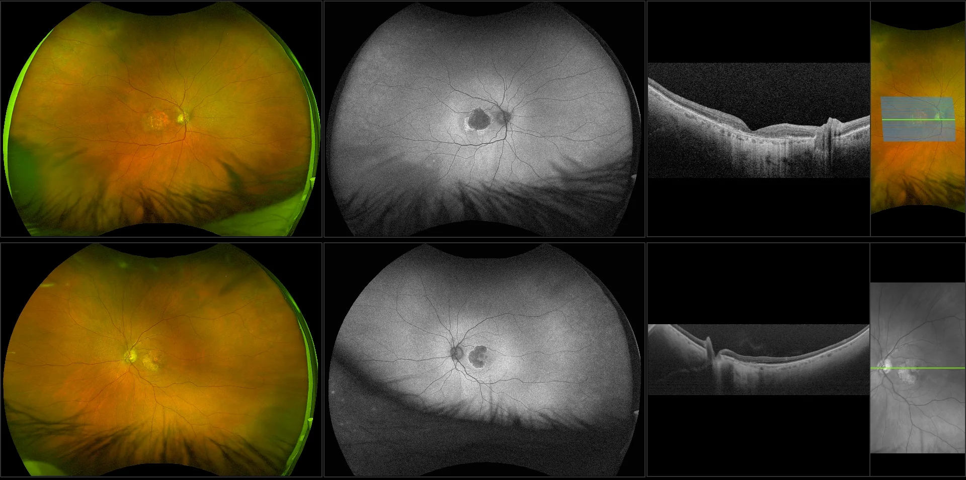 Silverstone - Retinitis Pigmentosa with Macular Hole and Geographic Atrophy RG AF OCT