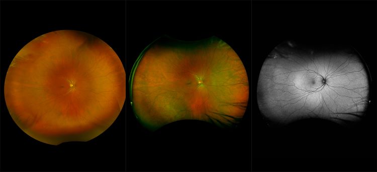A retinoschisis is a splitting of the sensory retina into 2 layers; an inner and outer layer. The etiology is most likely vitreous traction that physically pulls the retina apart. The posterior border of a retinoschisis is convex to the posterior pole, because a retinoschisis forms like blowing up a balloon in the peripheral retina (as seen in most retinal detachments).The inner layer can be shallow or bullous into the vitreous cavity. The inner layer may or may not have retinal vessels in it (depending if the retinal vessels pass into the inner layer or outer layer). Since the vessels in the inner layer are above the retinal surface like vitreous floaters, they can block the exiting light and produce a shadow effect ‘dark vessels’.