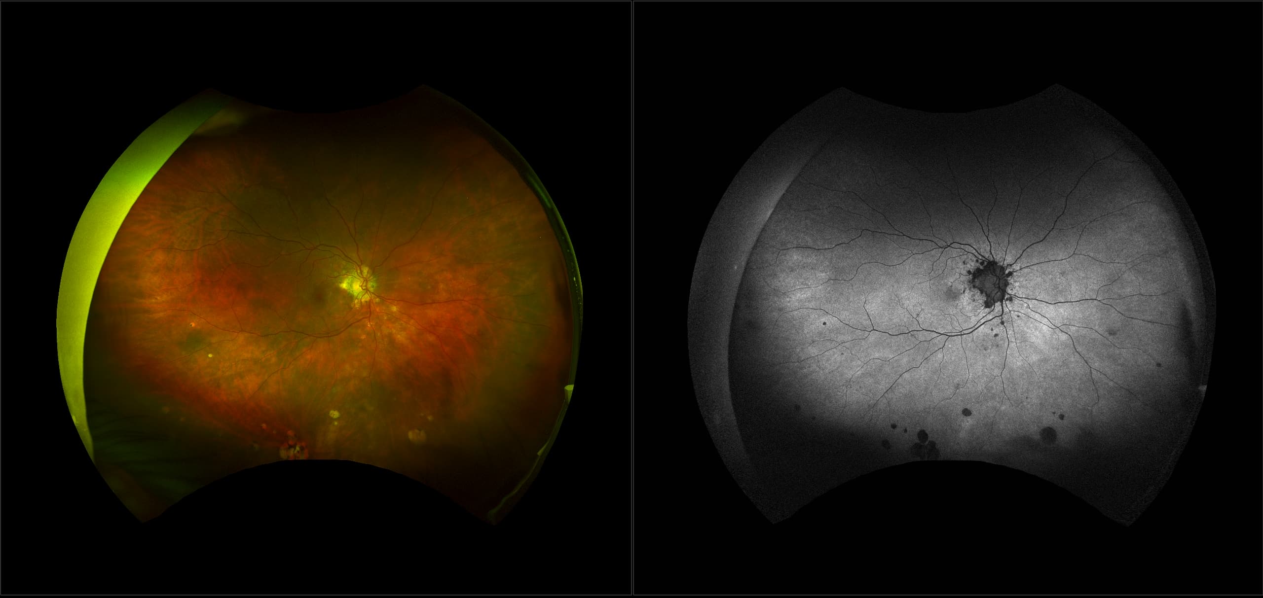 Why: A patient with uveitis was captured using optomap multimodal imaging. Images show inflammatory foci typical of uveitis in the mid to far periphery. These lesions correspond to each other on multimodal imaging. Interweave FA/ICG is often used when capturing uveitis. FA imaging may show pinpoint lesions and the ICG may help to confirm disease if lesions are seen in the ICG images.