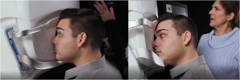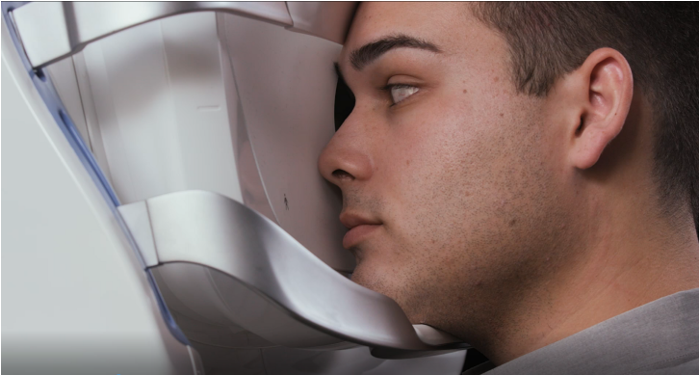 - Instruct the patient to sit up straight and look straight ahead, moving the chair forward so that they are directly in front of the device.