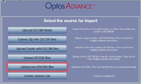 Sets of Non-DICOM files may be uploaded to OptosAdvance for one patient study at a time by following the instructions below.