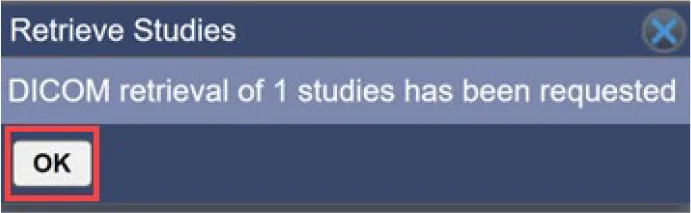 • Click OK in the Retrieve Studies dialog box to confirm DICOM retrieval 4 Click OK in the Retrieve Studies dialog box to confirm DICOM retrieval